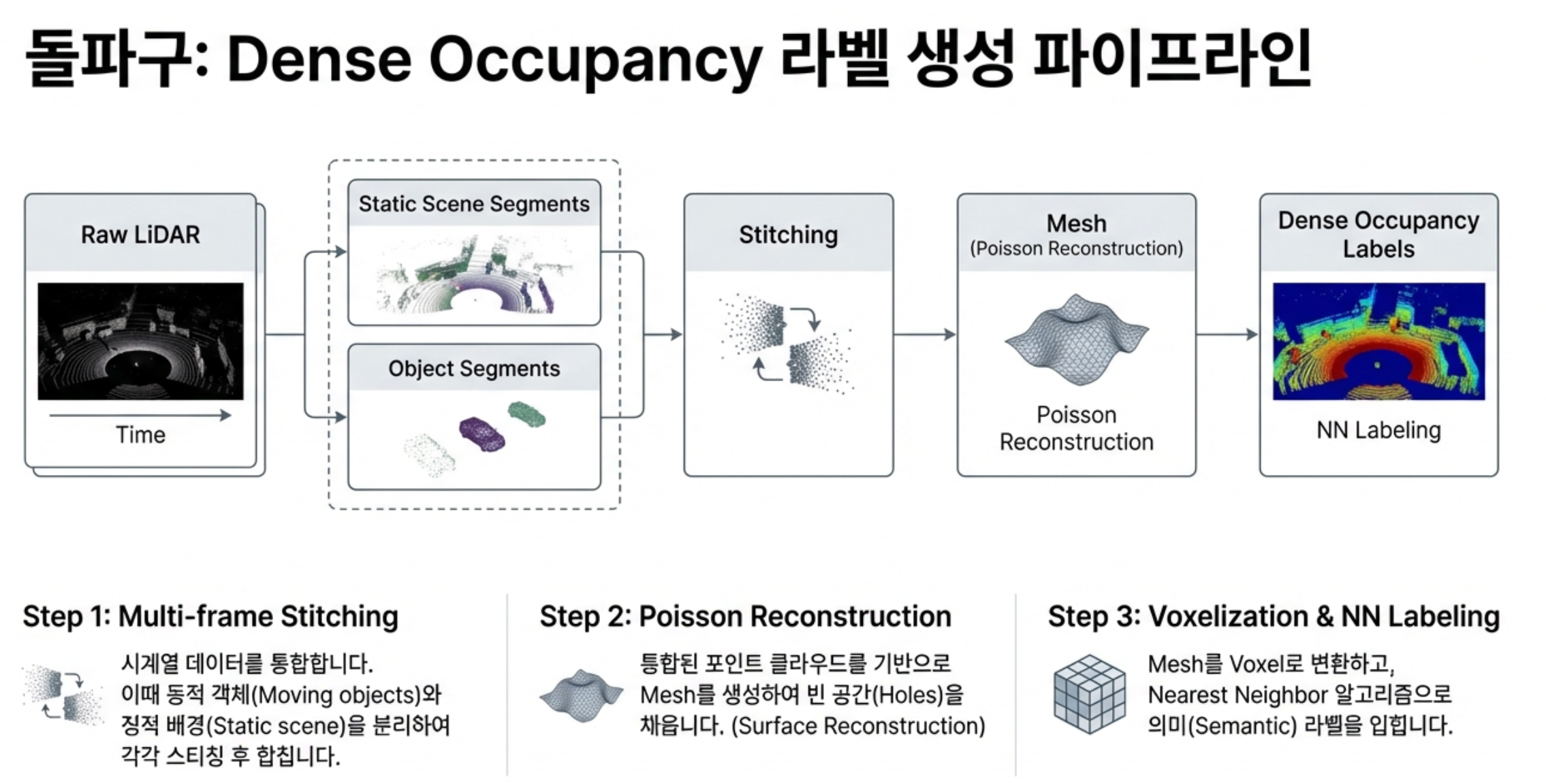 2. 동적 객체와 정적 장면의 다중 프레임 LiDAR 스캔을 분리 융합하고, 푸아송 재구성(Poisson Reconstruction)으로 구멍을 채워 매우 조밀한 점유 공간 라벨 자동 생성.