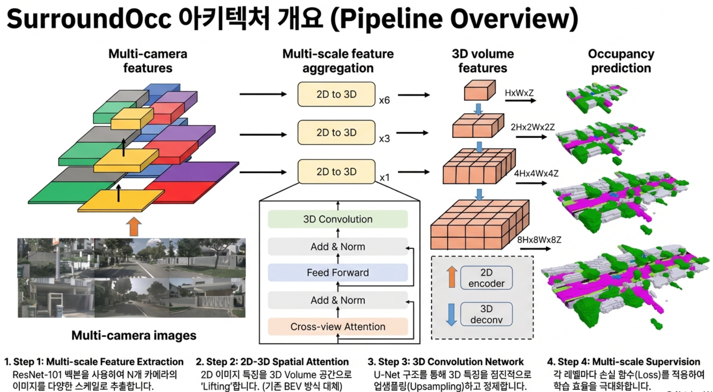 • 멀티 스케일 점유 공간 예측(Multi-scale Occupancy Prediction) 아키텍처로 세밀한 3D 표현 학습.